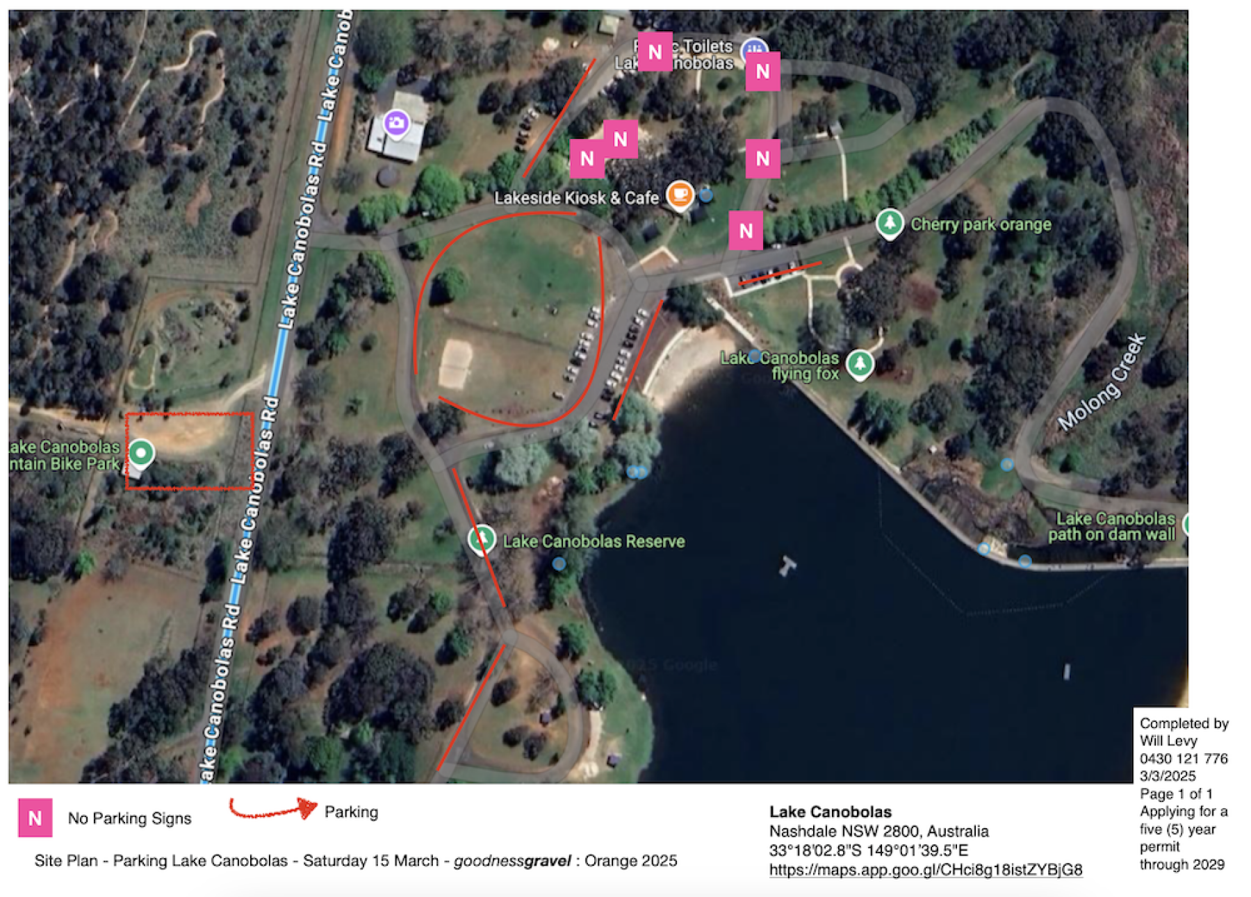 There is limited parking available at Lake Canobolas and there is also more parking over the road at Lake Canobolas Mountain Bike Park : 303 Lake Canobolas Rd, Nashdale NSW 2800 LINK